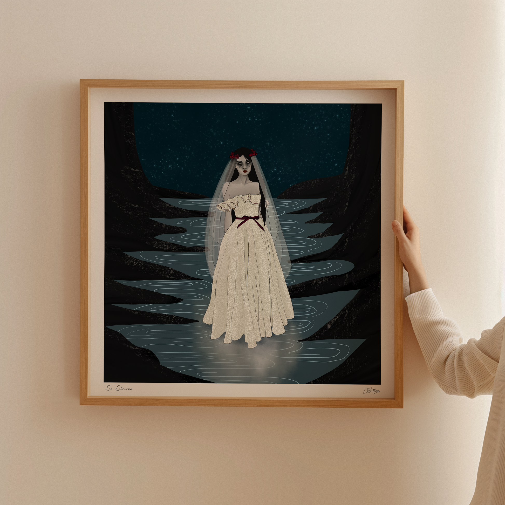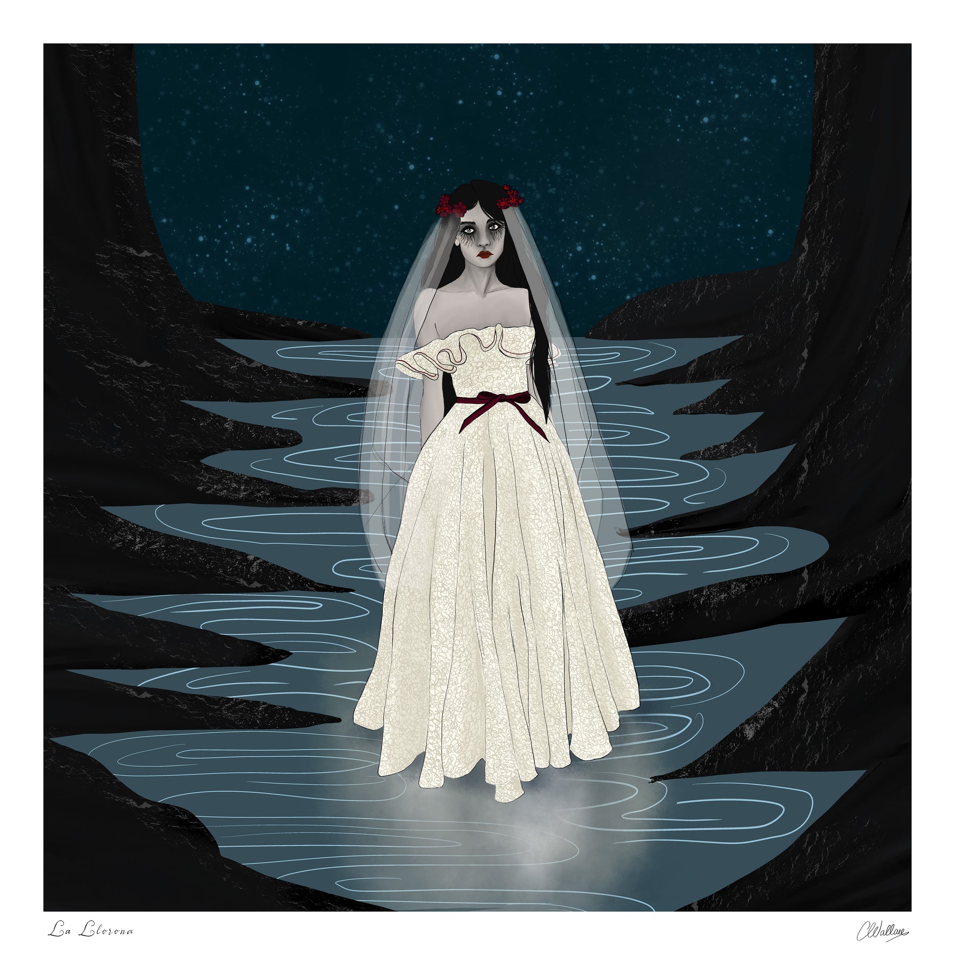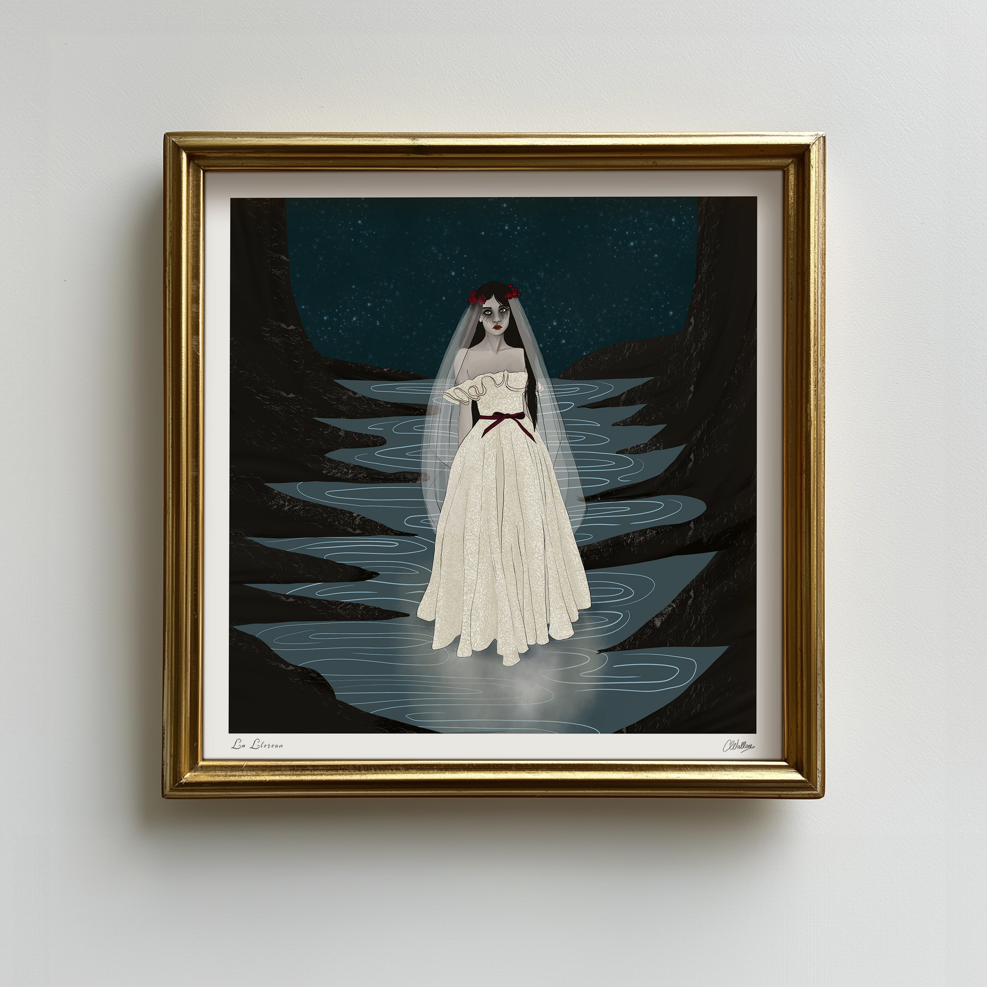 La Llorona, or "The Weeping Woman", is a ghostly figure said to wander rivers and lakes in search of what she has lost. In this interpretation, her sorrow is rendered with delicacy and depth - woven through shadowed waters and star-swept skies. Drawing on the Symbolist and Romantic traditions, the artwork explores feminine grief as something both powerful and otherworldly, evoking the tension between beauty and despair.