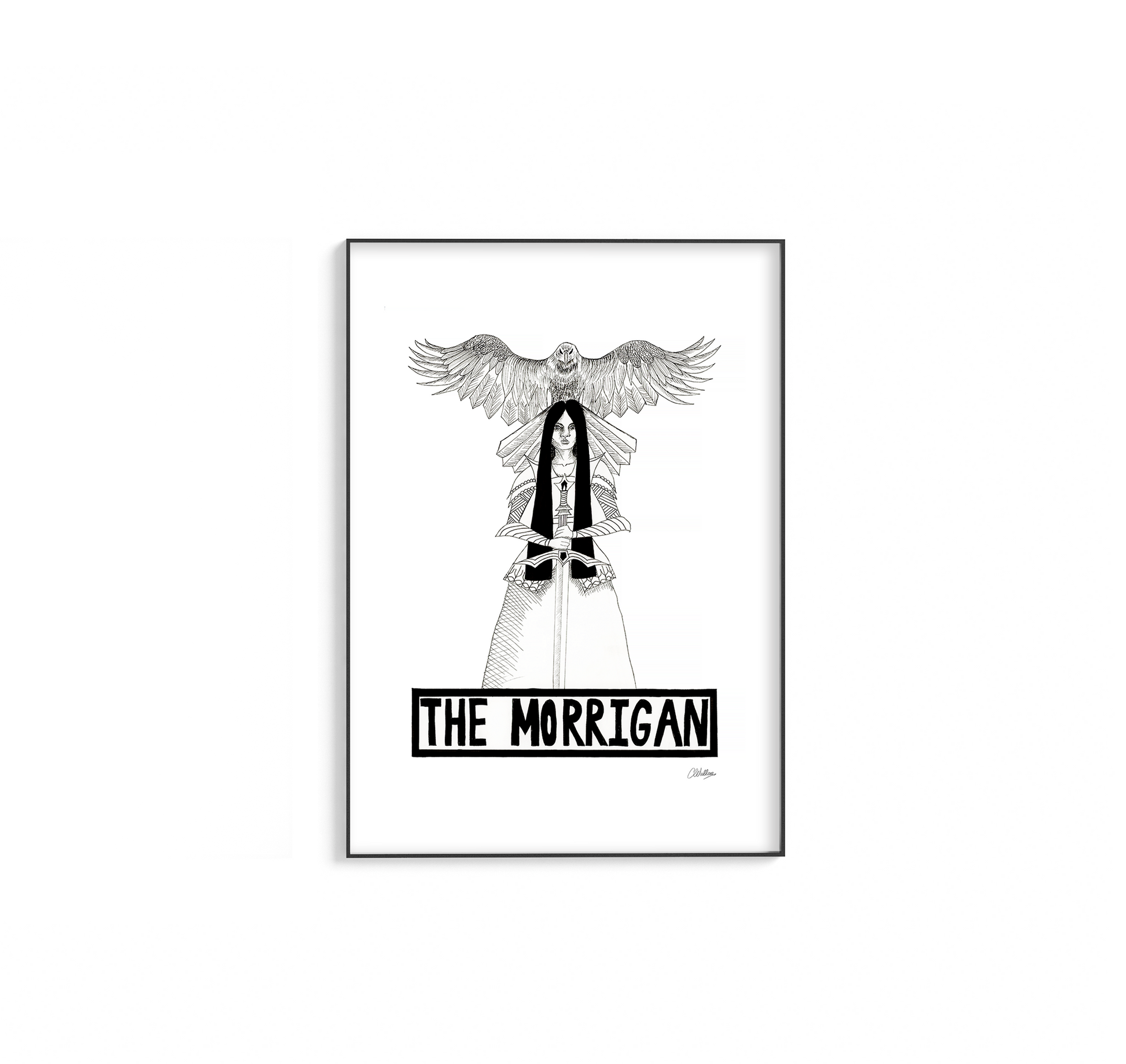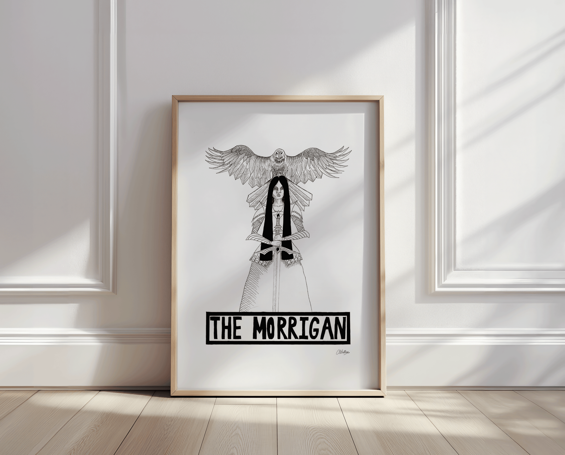 The intricate line work and stark contrast of black ink against white create a sense of timelessness, drawing inspiration from the Symbolist and Dark Academia traditions. The Morrigan's poised strength and the ethereal presence of the raven evoke a feeling of both boldness and mystery, offering viewers a glimpse into the mythological realms where beauty and darkness entwine.